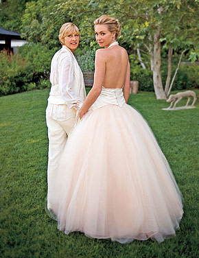 I wore pants to the wedding. A few months later I gave way to gravity and purchased my first blazer. Now my mother routinely watches the Ellen DeGeneres show and calls to give me detailed descriptions of Ellen’s latest unthreatening-to-liberal-middle-class-America lesbian fit.