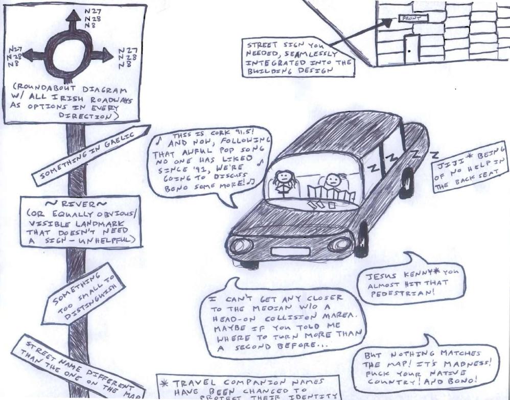 I managed to find my way back from Iowa to my safe haven of San Diego, but I have never fully escaped my shortcomings.  I recently took a trip to Ireland where my disorientation reached new heights.  The Irish take complicated Iowan roadway concepts such as multi-labeled highways a step further, often refusing to label streets altogether.  This is getting lengthy, so I have summarized my Irish navigational frustration with a drawing of a common street scene on my trip (click to enlarge):