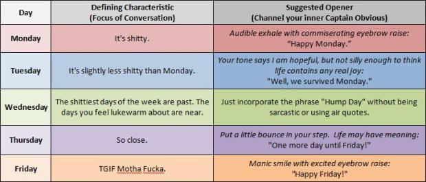 There is no better 15 second conversation topic than a day of the week.  One thing you can count on having in common with an office stranger is that given the choice, you’d both rather not be there.  When you work at an office, a calendar day and its proximity to the weekend comes with a universal set of meanings, intros and responses that lend themselves perfectly to the 15 second conversation.