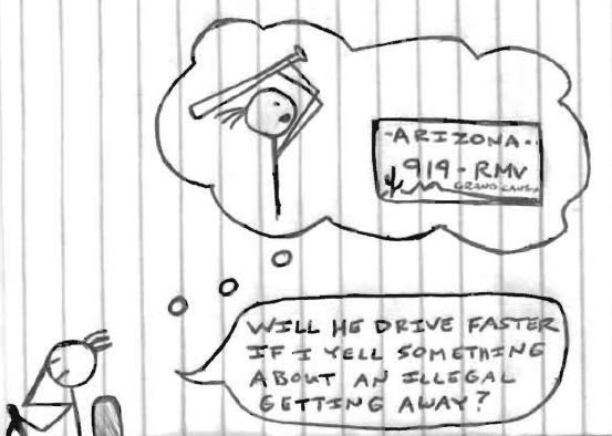 Haven’t you been listening to the traffic report?  It’s sticky through the Golden Triangle!  Throwing up your hands in exasperation when I refuse to rub bumpers with the car in front of me and inching sideways across five lanes of traffic to progress a total of twelve yards isn’t going to get you home any faster.  You won’t be intercepting this month’s issue of Jugs from the mail before your wife sees it.  Sorry!