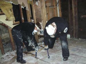 A lot of the gutting process was actually pretty awesome. When I was a kid, my mother used to take me into boutiques with endless shelves of colorful glassware and I would shove my shaking hands into my pockets and secretly fantasize about taking a baseball bat to the entire place. Last week, for the first time in my life, this destructive instinct was not only encouraged, it was considered an asset. It is strange going from, “Marea don’t throw the ball in the house, don’t leap up and slap to the door frame with your grubby hands, don’t drink that glass of juice on the couch” to, “Marea, we need more ventilation in the basement, please kick that window in.” During my first hour of gutting I cringed every time an errant board hit a doorframe or a piece of crown molding cracked as I pried it loose. By lunchtime I was a human wrecking ball. Can’t make that last bit of wall paneling budge with a crow bar? Sledgehammer. Can’t loosen the shower unit from the basement wall with that mild mannered wrench? Hammer the shit out of the pipe until it comes loose. For three days I pried up wood floors, smashed hammers into drywall and generally unleashed an enthusiastic whirlwind of destruction on a series of Iowa homes. At the end of the day I shook the hands of the homeowners and was told I was a good and selfless person for my efforts. A hippie named Flower fed us a free lunch out if his rainbow trailer and told me I had a beautiful soul. Amazing.