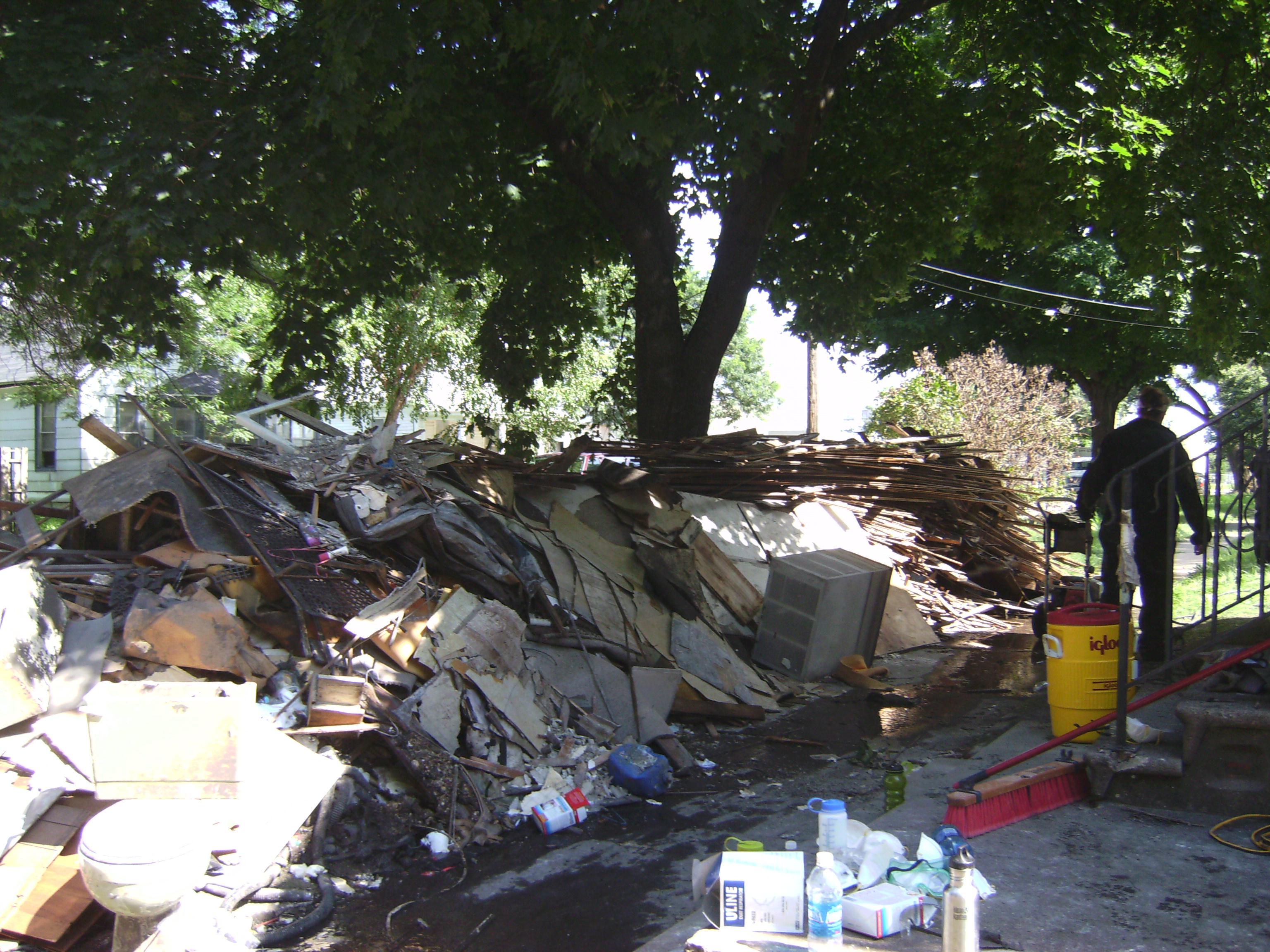 Ok, back to the positivity…There were actually some aspects of training that I found very rewarding. I got to participate in a three day project “gutting” flooded houses in Cedar Rapids to help get them ready for their eventual remodeling. Much of the flood damage in Vinton had been cleaned up by the time I arrived in Iowa, so this was the first time I really got a sense of the devastation caused by the disaster. Many neighborhoods in Cedar Rapids are still ghost towns with block after block of abandoned houses and boarded up businesses. The sidewalks in front of each empty house are piled high with the remnants of the owners’ lives, from the furniture to the floorboards. All of these houses need to be stripped down to the studs before they can be remodeled into a livable condition, and this was our job. We got very little instruction; the church running the relief effort literally gave us a piece of paper titled “House Gutting 101”, an address and a GPS system and sent us on our way.