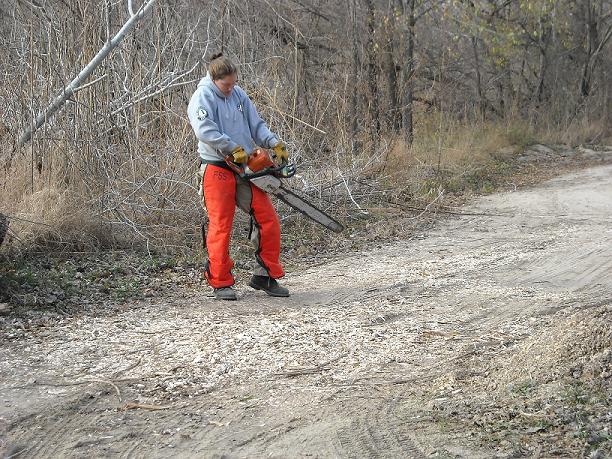 As punishment for our efficiency, we spent the remainder of our time with the JCCB dragging trees to a wood chipper amidst “snow flurries”, a unique weather condition that it is apparently wimpy to complain about because while it is characterized by precipitation that is white, frozen and the cause of dampness and misery, it melts when it hits the ground and is therefore NOT snow. In the words of the park ranger John, the slightly terrifying former military officer who felled the trees we wrestled into the chipper, “Wutareya cold? Shit, if I wasn’t chainsawin’ today I’d be in shorts right now!” (One thing I’ve learned about Iowans is that they are disgustingly proud of their cold weather and ability to endure it. Nothing makes an Iowan happier than telling you about last winter’s record lows or about how this winter is supposed to be the coldest yet. They also enjoy cheerfully agreeing with you when you half-jokingly suggest that you will perhaps die before Spring since you are shivering in the warmest outfit you own and it’s only November.)