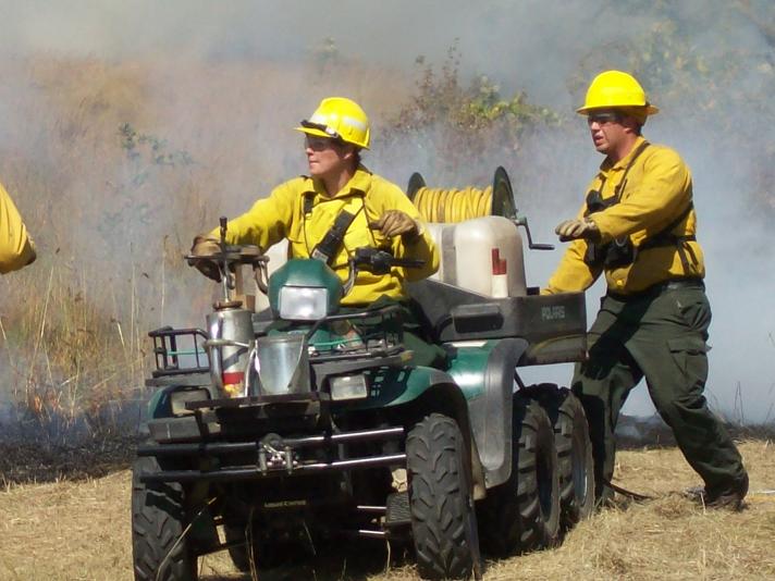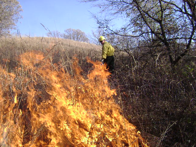 Our other job with Plymouth County was assisting with controlled burns, another method of wiping out invasive species and helping native prairie species grow back stronger. To participate in burns, we had to take a week of classroom training to become certified in wildland firefighting and pass a “pack test” – walking three miles with a fifty pound pack in less than forty-five minutes – which is more challenging than it sounds. Lighting prescribed fires involves the use of a drip torch which is essentially a tank of fuel with a flame at the nozzle that allows you to leave a line of fire behind you as you walk. I have never experienced anything as empowering as walking down a ridge with a drip torch and then looking behind me to see a wall of flames enveloping acres of prairie grass. We also got to shoot water at the fire, but of course that wasn’t nearly as satisfying. Chainsawing, burning, house gutting…so far AmeriCorps has just been one big orgy of destruction for me. If one of our next projects is tutoring children or helping senior citizens with their taxes, I’m afraid I might accidentally charge one of them with a hammer.