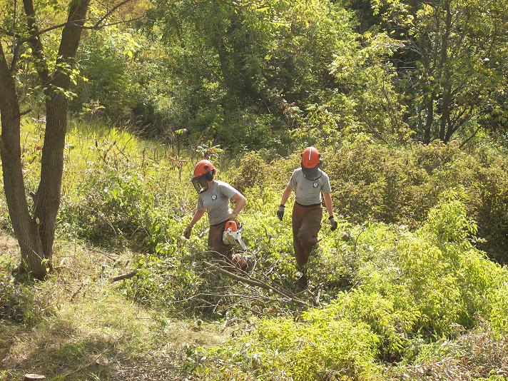 Work took up most of our time which was fortunate for me because I loved our job. We worked with both the Plymouth County Conservation Board and the Iowa chapter of the Nature Conservancy doing prairie restoration. When we were working for the county we used chainsaws, brushcutters and brush mowers (multi-speed lawn mowers that can take out small shrubs and trees) to cut down the invasive plant species encroaching on the native prairie and its inhabitants. We usually worked in pairs on the preserve, with one of us sawing and another person “swamping” or moving fallen trees out of the way of the sawyer as we made our way through the brush. We would start at the bottom of a ridge, cutting a swath about ten feet wide through thick vegetation, often hiking over a hundred yards up steep terrain before reaching the top and then heading back down to start again. Add the twenty pound saw we were hauling around and the frequent trips down to the truck for gas and you can imagine the impressive physical condition I must be in. Wrong. As it turns out, a diet based on a $4.50 per day stipend of Wal-Mart food and a job that involves lugging heavy objects slowly up hills results in what I call the “Plymouth County Body” (PCB): a dark brown neck and forearms and a large belly and muscular shoulders the color of paste. The PCB is named after the five or so identical county conservation employees we worked with who I’m pretty sure hunt for cardio and survive primarily on Mountain Dew and deer jerky.